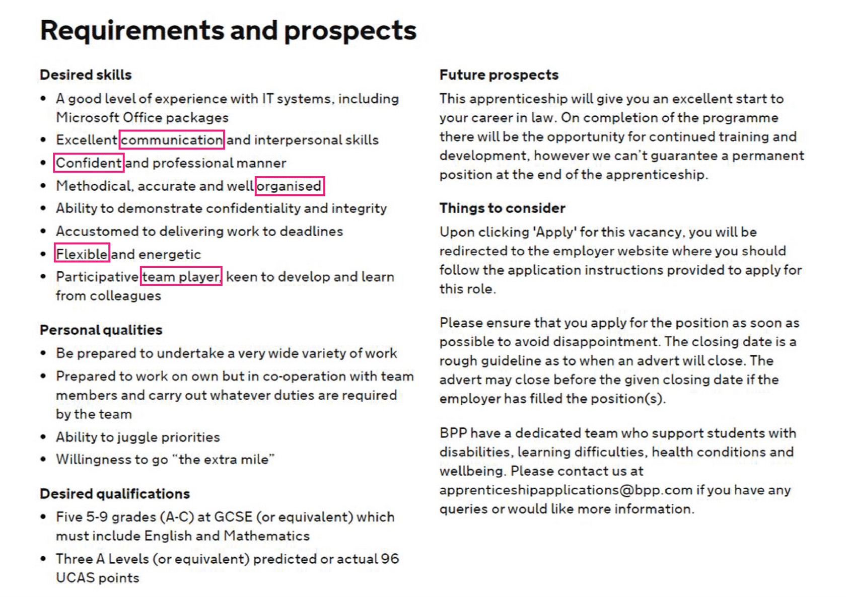 Now below are the soft skills highlighted. You will notice that things like IT skills or GCSEs haven’t been included. That is because here we are just interested in the soft skills the employer is looking for, not the hard skills.